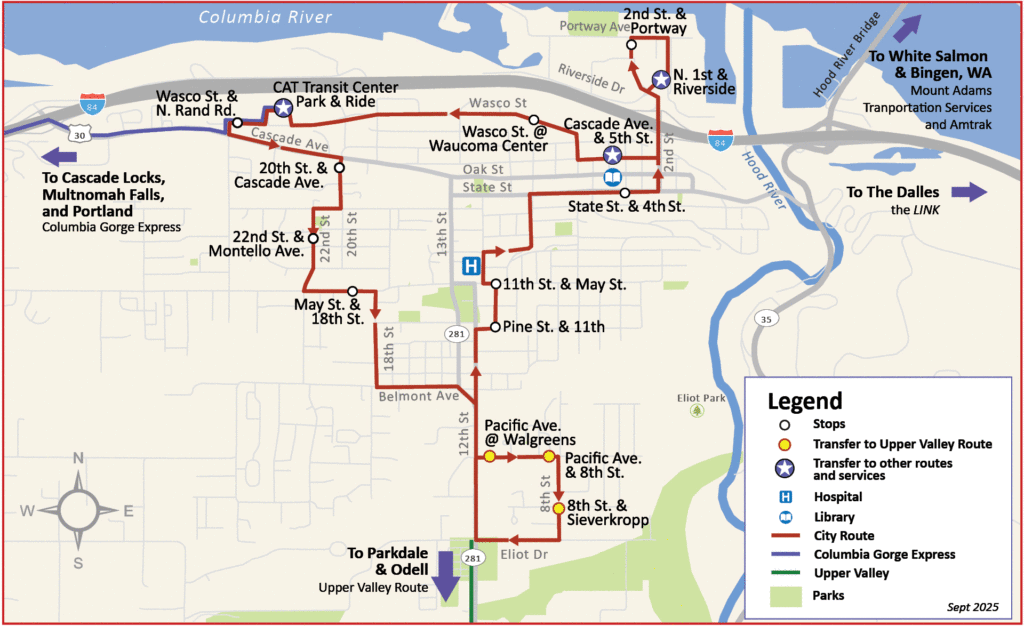 | CAT Transit Center | Wasco St. & N. Rand Rd. (Walmart) | 20th St. & Cascade Ave. (Safeway) | 22nd St. & Montello Ave. | May St. & 18th St. (Aquatic Center) | Pacific Ave. @ Walgreens | Pacific Ave. & 8th St. (One Community Health) | 8th St. & Sieverkropp Dr. | Pine St. & 11th St. | 11th St. & May St. (Hospital) | State St. & 4th St. (Library) | N. 2nd St. & Portway Ave. | N. 1st St. & Riverside | Cascade Ave. & 5th St. | Wasco St. @ Waucoma Center | CAT Transit Center |